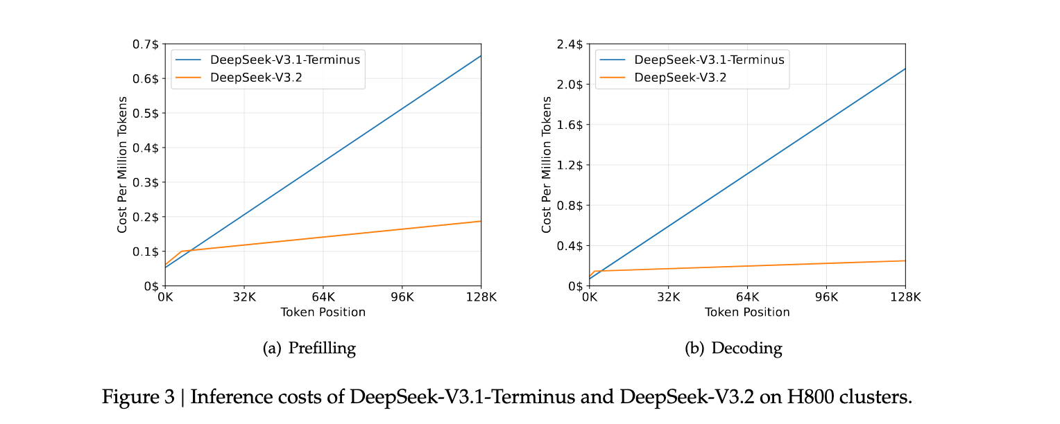 DSA机制显著降低了长序列处理的计算成本。在H800 GPU集群上,DeepSeek-V3.2在128K token位置的预填充成本仅为每百万token约0.2美元,而DeepSeek-V3.1-Terminus需要约0.7美元。在解码阶段,DeepSeek-V3.2在128K位置的成本约为每百万token1.6美元,而DeepSeek-V3.1-Terminus需要约2.4美元,实现了约33%的成本节约。