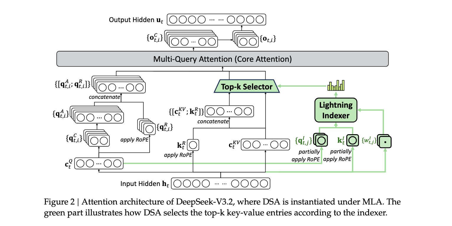 - DeepSeek Sparse Attention (DSA) :引入高效注意力机制,将核心注意力复杂度从 O ( L 2 ) O(L^2) O(L2)降低至 O ( L k ) O(Lk) O(Lk),其中 k ≪ L k \ll L k≪L为选择的token数量,在保持长上下文性能的同时显著提升计算效率