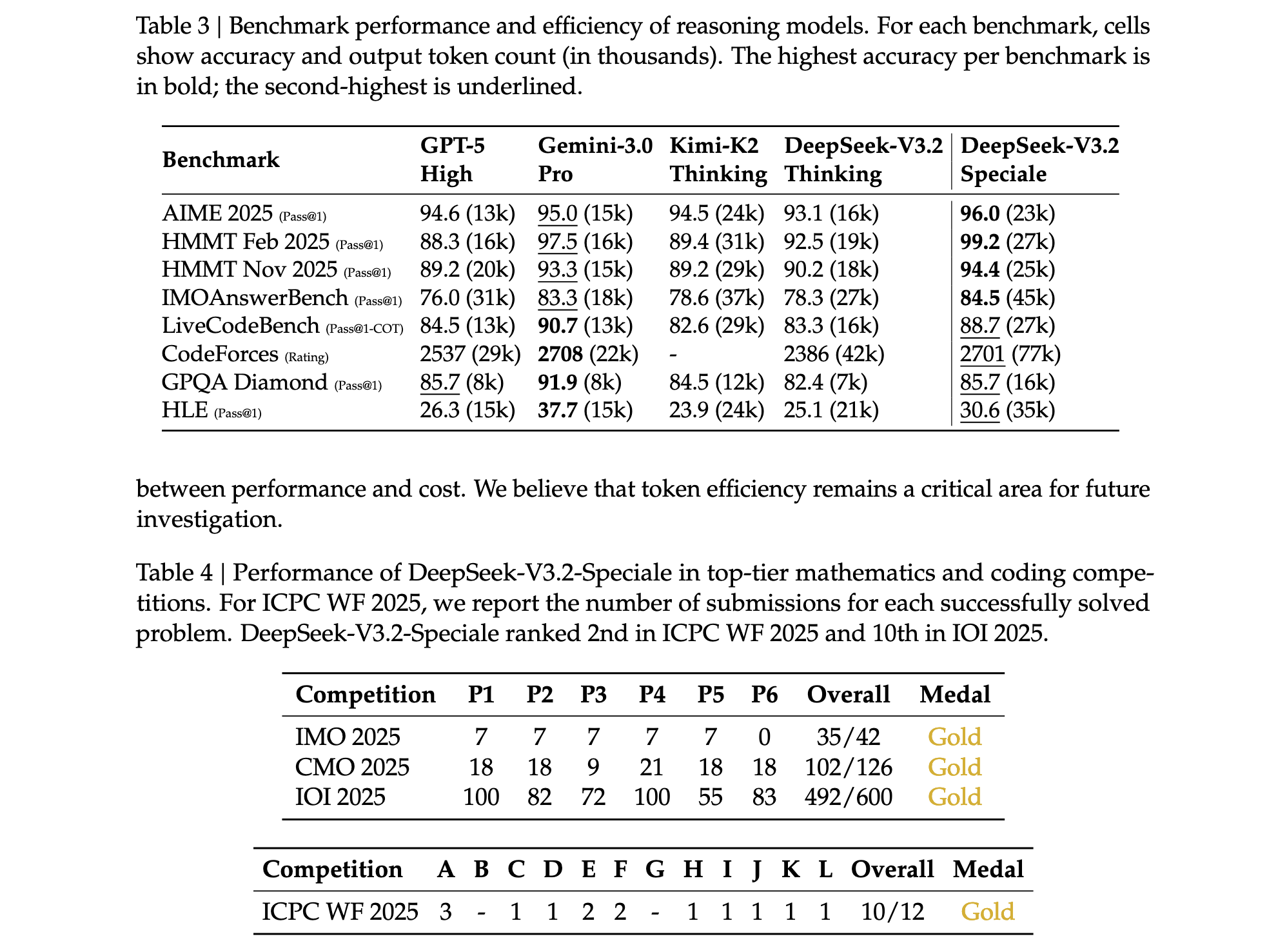 特别值得注意的是,DeepSeek-V3.2-Speciale通过放宽长度约束获得了更优异的性能:AIME 2025达到96.0%,HMMT 2025 February达到99.2%,IMOAnswerBench达到84.5%,在多项指标上超越了Gemini-3.0-Pro。该模型还在2025年国际数学奥林匹克(IMO)和国际信息学奥林匹克(IOI)中获得金牌水平表现,这是开源LLM的里程碑式成就。