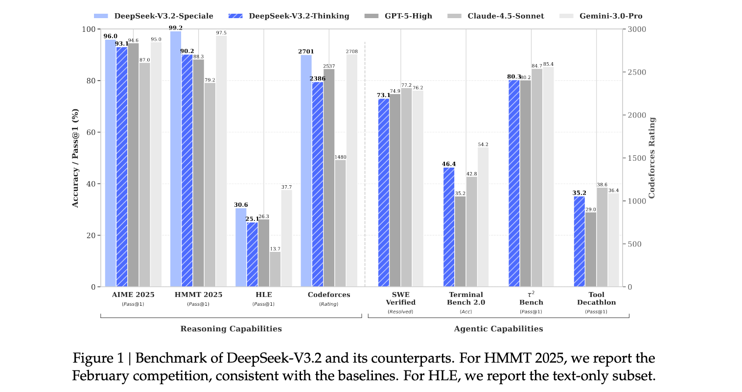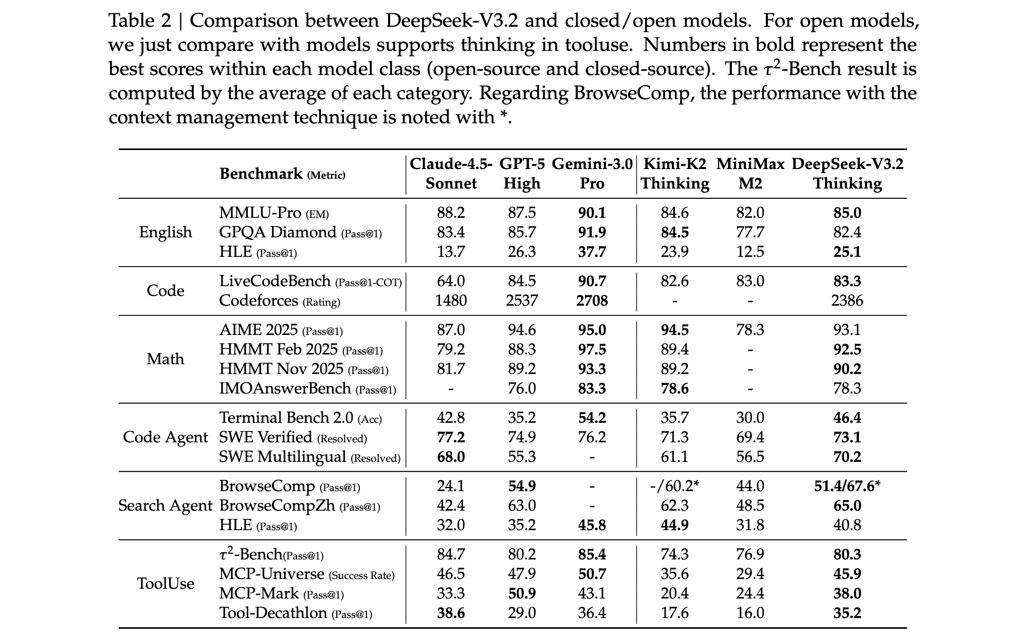 DeepSeek-V3.2在多个基准测试中表现出色,特别是在推理和智能体任务方面显著缩小了与闭源模型的差距。