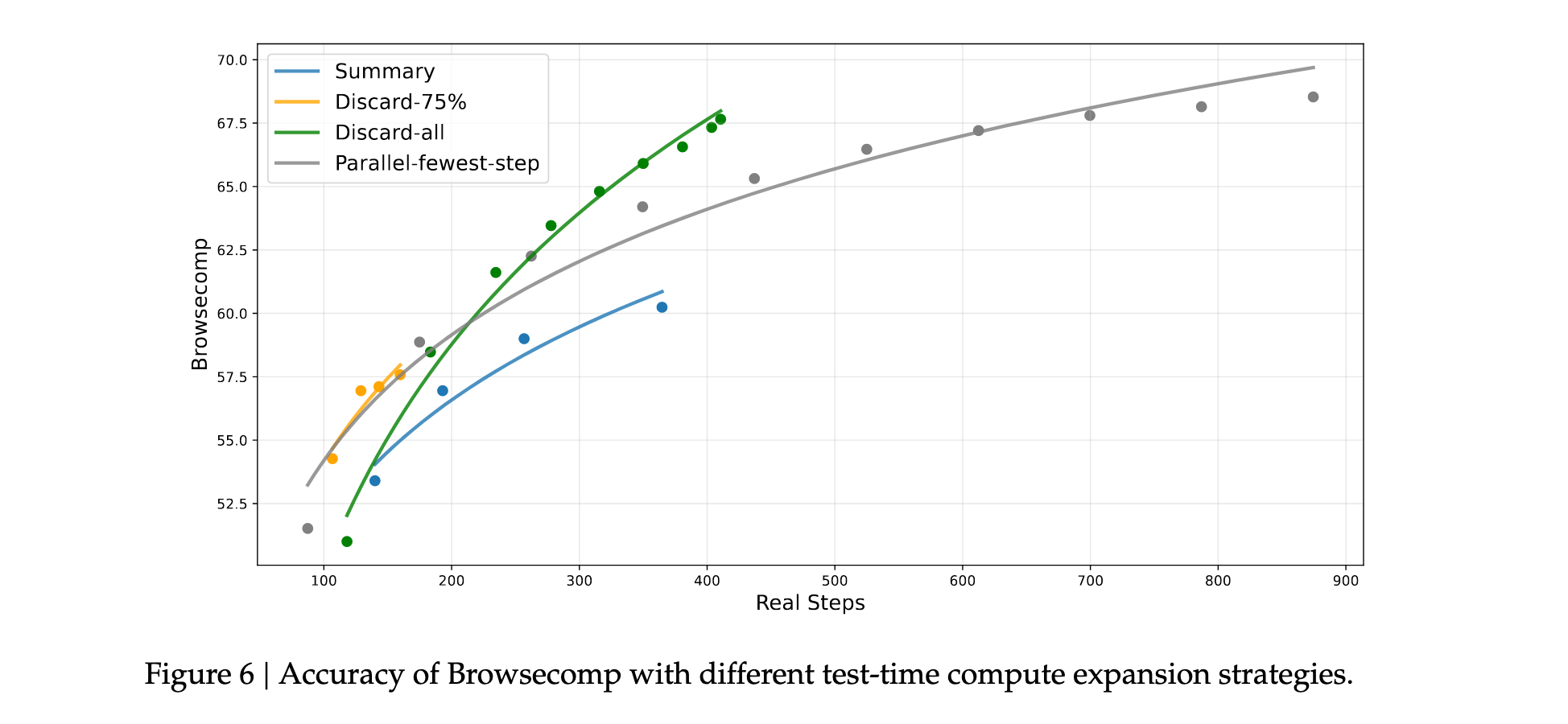 研究者在BrowseComp基准测试上评估了不同的测试时计算扩展策略。结果表明,上下文管理策略通过允许模型扩展测试时计算,显著提升了性能。例如,Summary策略将平均步数从140扩展到364,性能从53.4提升到60.2。Discard-all策略在效率和可扩展性方面表现良好,达到67.6的分数,与并行扩展相当但使用的步骤显著更少。