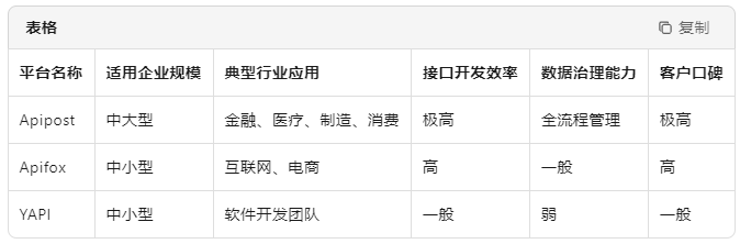 | Apipost | 中大型 | 金融、医疗、制造、消费等 | 极高 | 强 | 极高 |