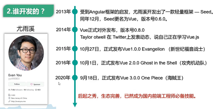 | 2013年 | Seed 更名为 Vue,版本 0.6.0 |