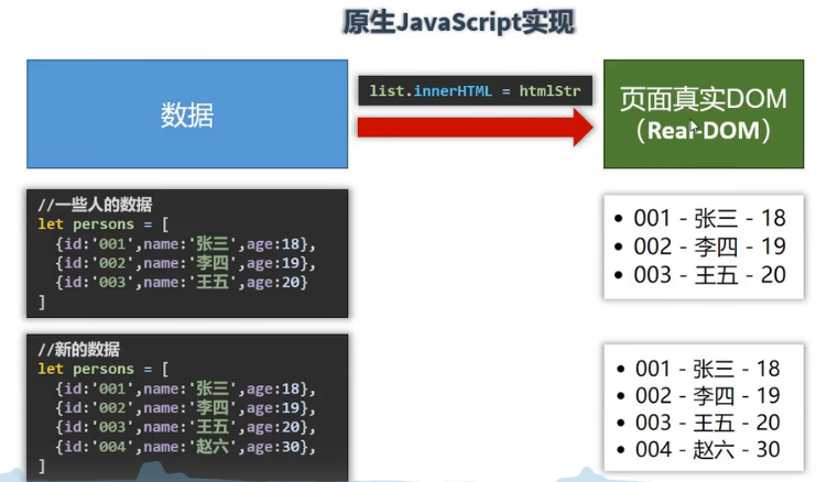 当数据变化时,原生 JavaScript 会重新生成整个 HTML 字符串并替换原有内容,导致频繁重绘和回流,影响性能。