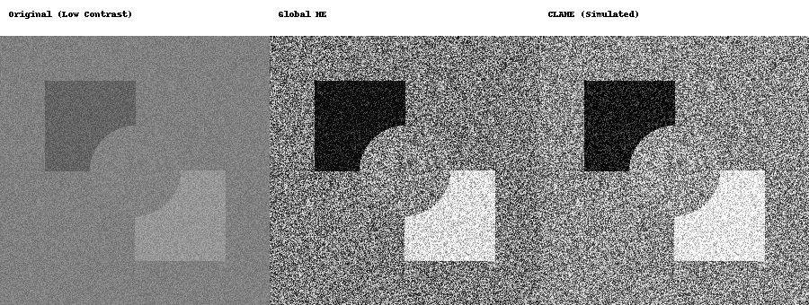 图3-1: 原图(低对比) vs 全局均衡化(HE) vs 自适应均衡化(CLAHE)