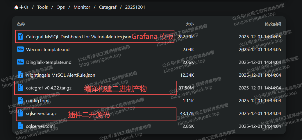 温馨提示:下面实践中作者采用了自行修改源代码后的 categraf 采集工具,以采集更多的 SQL Server 数据库相关指标,当然你也采用官方提供的二进制包部署实践不会影响实践,采用夜莺监控平台自带的监控面板,若要使用作者设计的 Grafana 看板模板,则需要修改 categraf 源代码编译后使用,本文实践的相关配置、监控面板、预警规则都放在作者网盘中了,各位看友请在文末或者作者知识星球原文中获取下载地址。