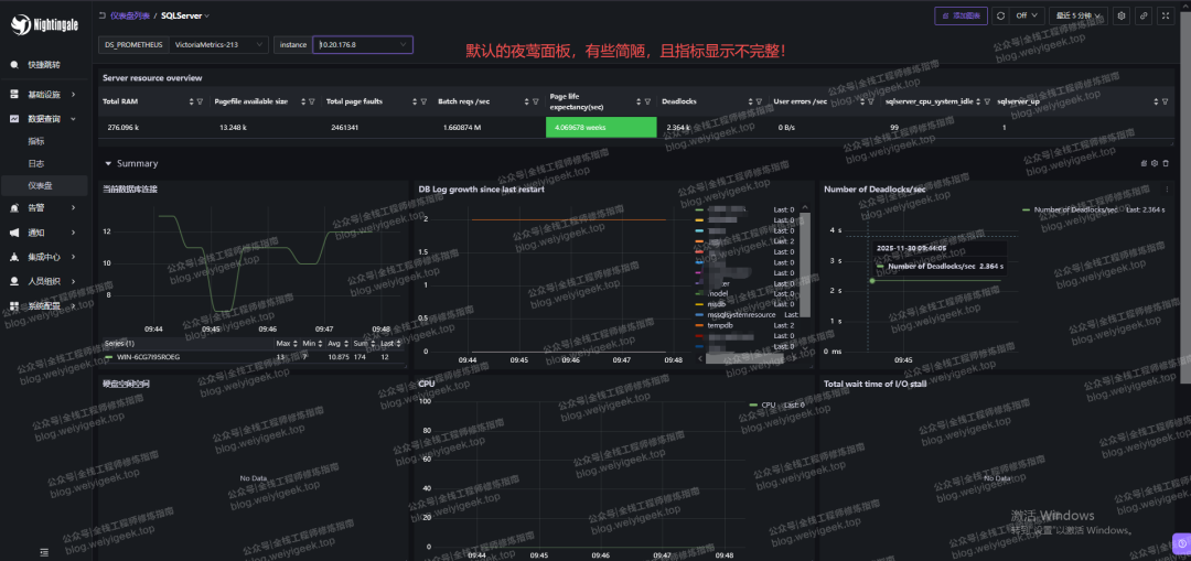 经过作者在 SQL Server 2008 R2 中测试后发现其采集的指标并不全面,并且在夜莺自带的模板中展示也存在缺失,比如:数据库基础信息指标、性能指标等,如下图所示: