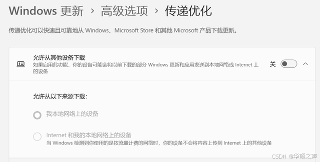 步骤:【设置】→【Windows 更新】→【高级选项】→【传递优化】→ 关闭 "允许从其他设备下载"。