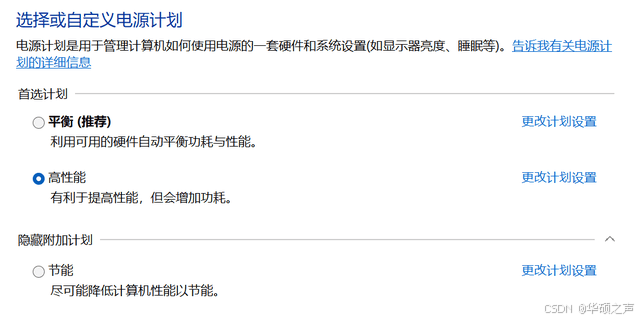 选择【高性能】(没有的话点击 "创建电源计划" 手动新建);