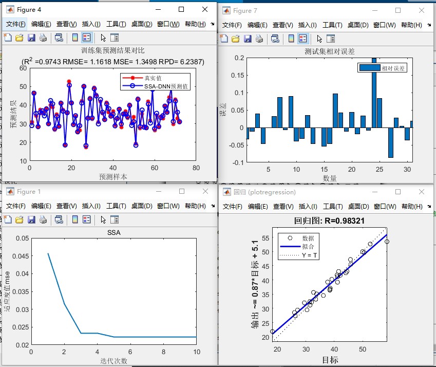 SSA-DNN回归 基于麻雀搜索算法(SSA)-深度神经网络(DNN)的数据回归预测(可更换为分类,单变量和多变量时序预测,前私),Matlab代码,可直接运行,适合小白新手 无需更改代码替换数据集即可运行 数据格式为excel 可以根据需要定制更换算法例如24年最新算法CPO,BKA,RBMO等,或者PSO,WOA,GA,GWO,ABC等都可以 1、运行环境要求MATLAB版本为2019b及其以上 2、评价指标包括:R2、MAE、MSE、RMSE等,图很多,符合您的需要 3、代码中文注释清晰,质量极高 4、测试数据集,可以直接运行源程序 替换你的数据即可用 适合新手小白 5、 保证源程序运行,
