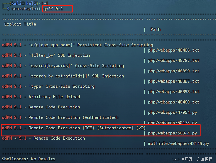 动作 :利用 Kali Linux 内置的搜索工具或直接访问 Exploit DB 等在线漏洞库,以 "qdPM 9.1" 为关键词进行搜索。