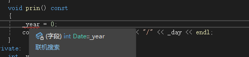 const 修饰Date类的Print成员函数,Print隐含的this指针由 Date* const this 变为 const Date* const this,const修饰指针的"左定值,右定向"。