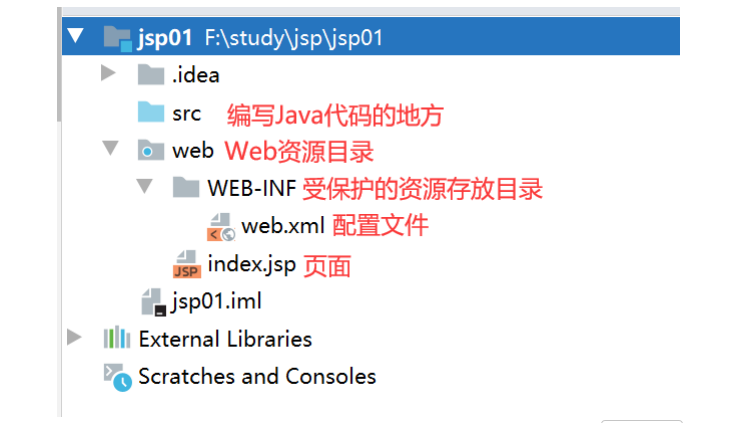 受保护目录(浏览器无法直接访问):存放web.xml(配置文件)、lib(项目依赖JAR) |