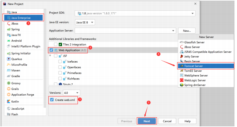 New Project→ 左侧选择Web Application (4.0)→ 勾选Create web.xml(关键,生成配置文件) -
