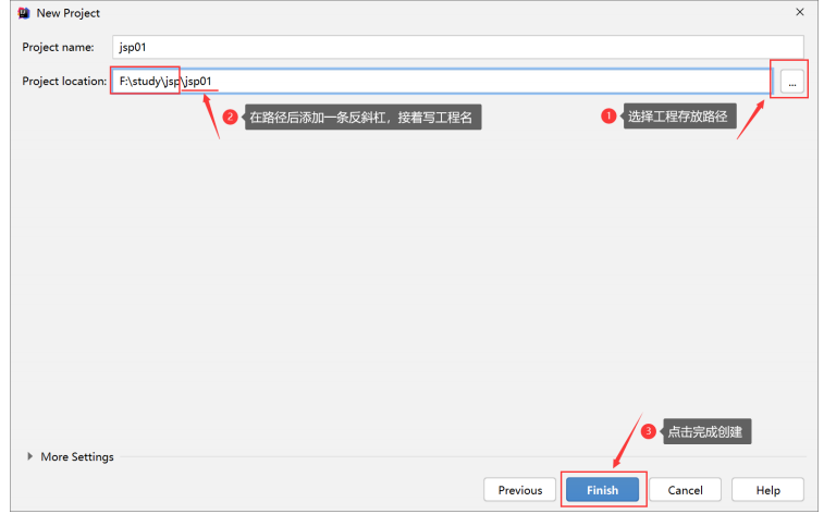 Project name填jsp01,Project location选择存放路径(如F:\study\jsp01) → 点击Finish