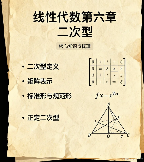 其中 aija_{ij}aij 是实数,且 aij=ajia_{ij}=a_{ji}aij=aji(对称性)。例如,二元二次型为 f(x,y)=ax2+2bxy+cy2f(x,y)=ax^2+2bxy+cy^2f(x,y)=ax2+2bxy+cy2。