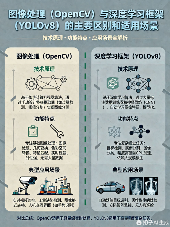 图像处理(OpenCV)与深度学习框架(YOLOv8)的主要区别和适用场景详细说明