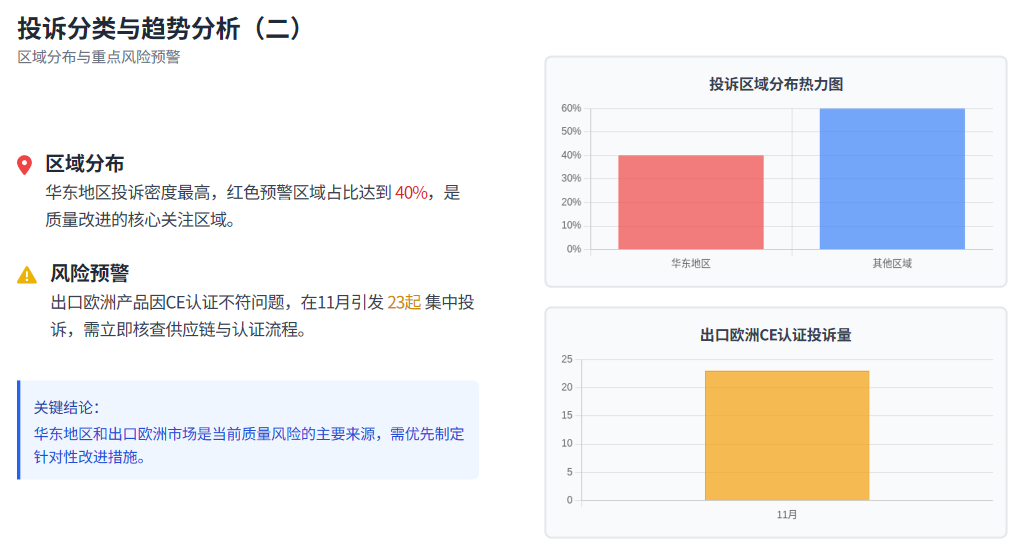 自动分析阶段:机器学习模块自动完成投诉分类(准确率91%)、趋势分析、异常识别。例如系统发现"液压系统泄漏"投诉在三季度环比上升37%,并自动标记为重点关注问题。