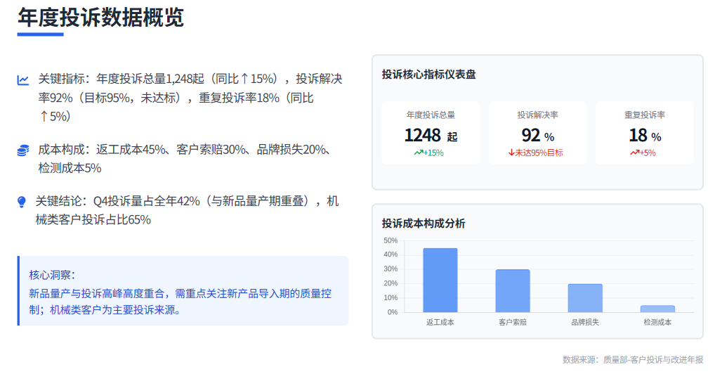 某重型机械制造企业的质量管理部,每月需要编制《客户投诉与改进年报》,传统流程需经历数据收集(2天)、分析图表(1天)、报告撰写(2天)、格式调整(0.5天)四个环节,总计耗时5.5天。