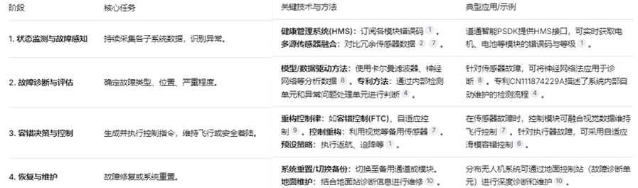 典型无人机故障处理模块的运行遵循一个分层递进的逻辑,具体流程和关键技术如下表所示: