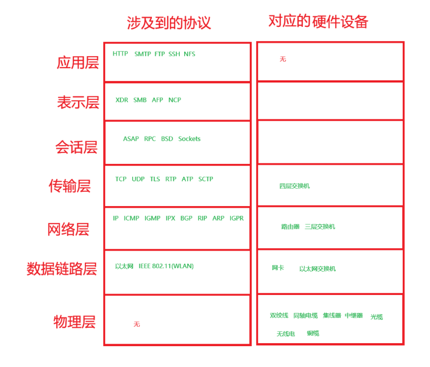 | 表示层 | 面向服务 | 数据格式定义、转换 / 加密 | XDR、ASN.1、SMB、AFP、NCP |