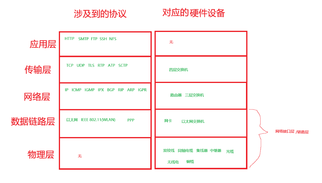 - 对下:直接与物理介质交互,将电信号、光信号或无线电信号通过物理介质进行传输