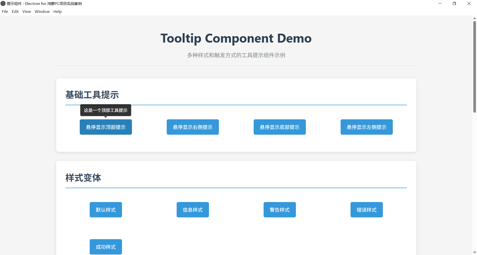 这是一个基于Electron开发的工具提示(Tooltip)组件示例项目,展示了如何在桌面应用中实现功能丰富、样式多样的工具提示效果。