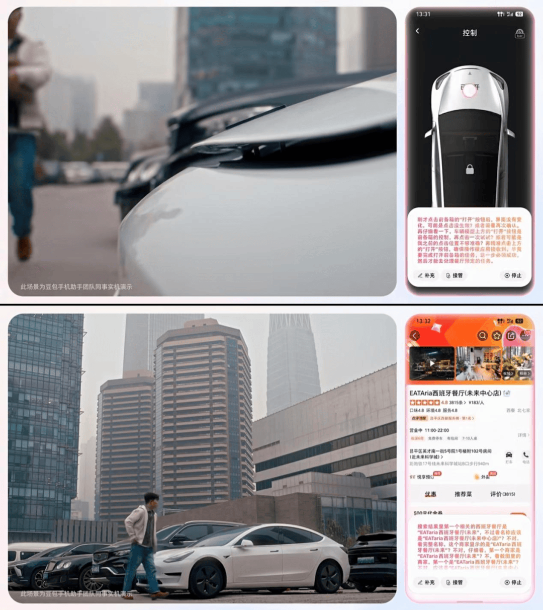 甚至在更复杂的跨场景链路中,豆包也游刃有余。用户可一次性发出多个指令,如:"订阅这个播客的更新并加入播放列表 → 打开特斯拉前备箱 → 订一个今晚八点半的餐厅",助手将依次在对应App中完成操作,串联起本地应用与线下行为。
