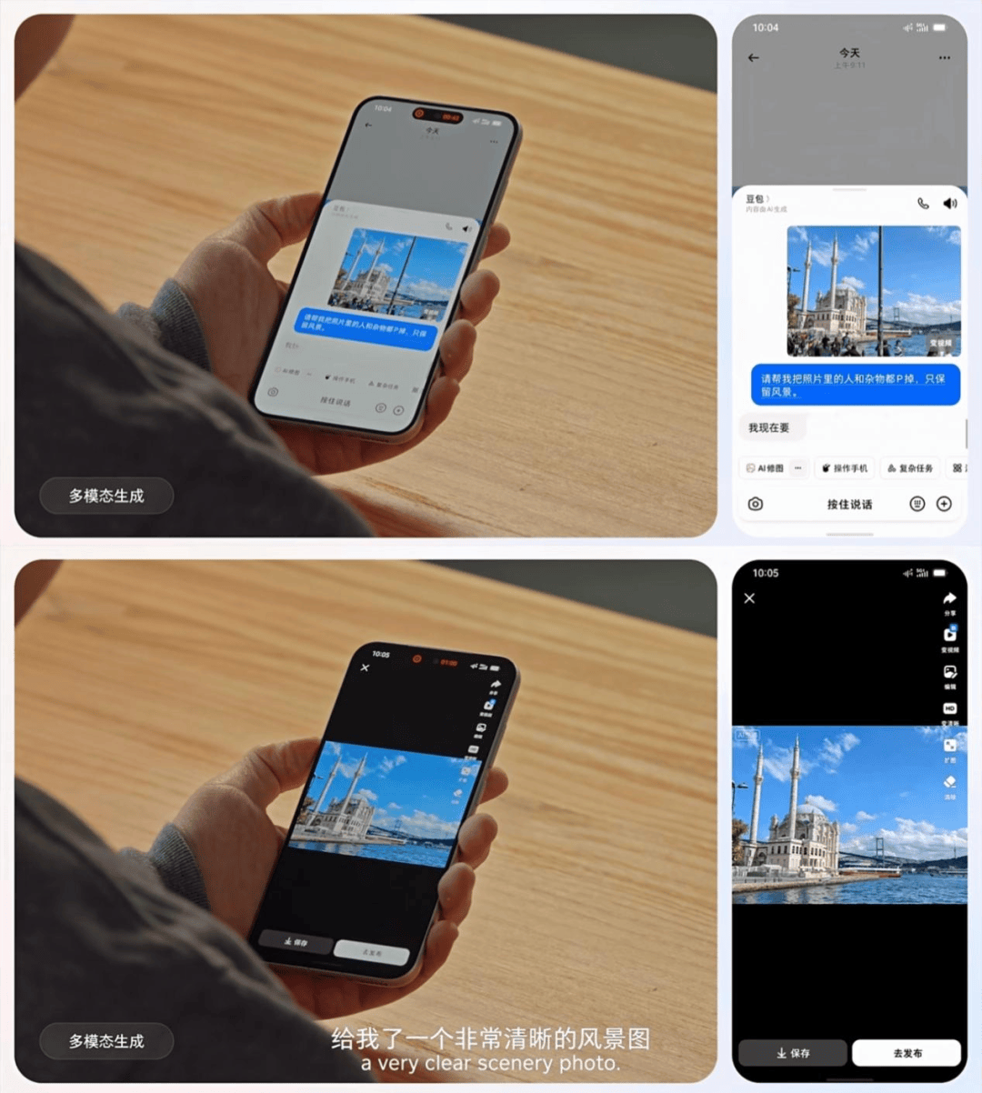 再如图片处理,用户说"把这张照片里的人去掉""把背景清理一下",助手可以自动识别目标区域、调用图像编辑工具并完成操作,无需用户打开App逐步执行。