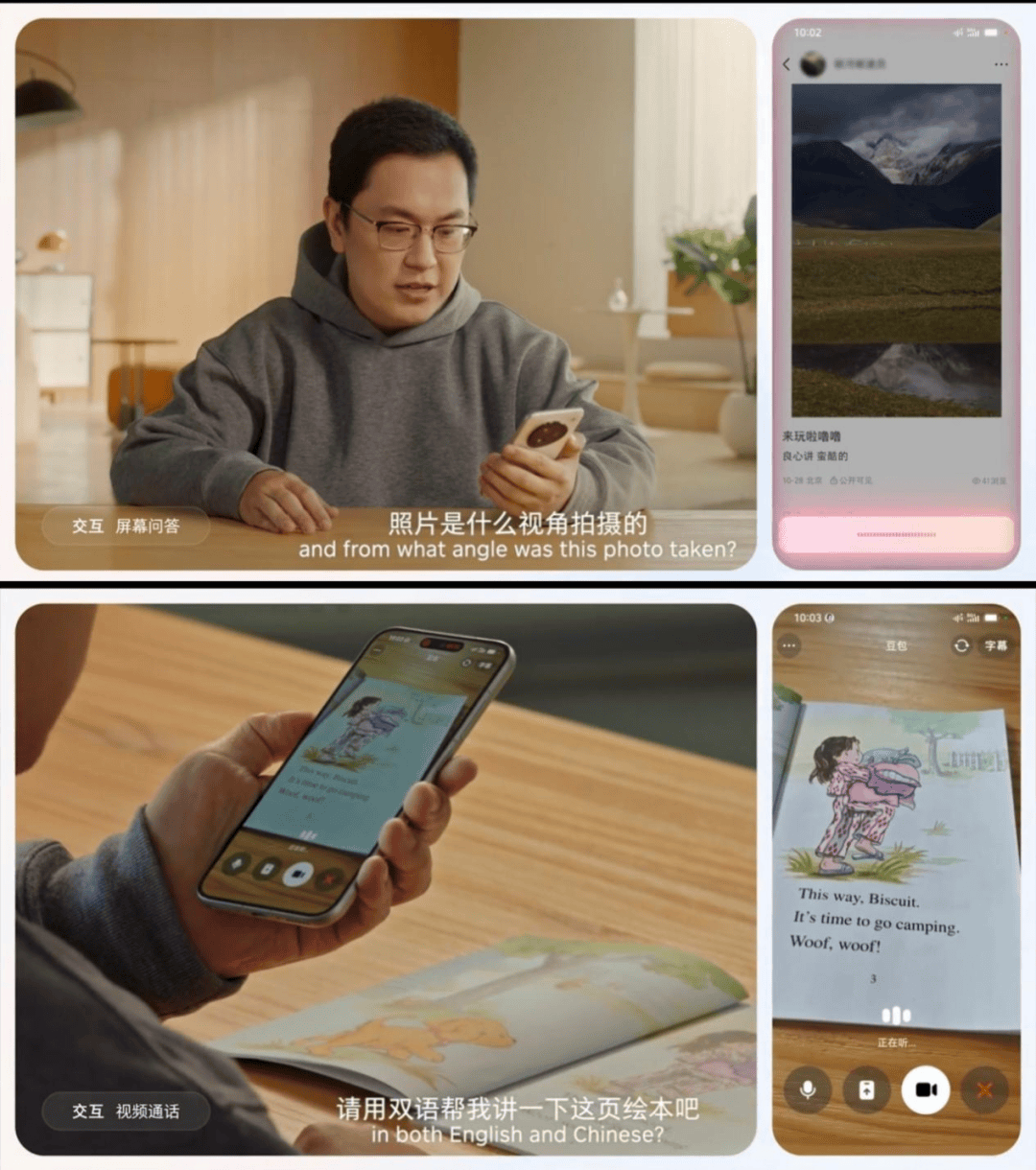 用户无需复制内容或切换App,在任意界面都可以直接发起询问;屏幕内容会被即时理解,例如对照片提问"这个景点在哪""是从什么视角拍的",助手直接返回信息;原豆包生态中的语音通话、视频通话、屏幕共享等能力被系统级集成,仅需双击AI键即可进入实时对话。