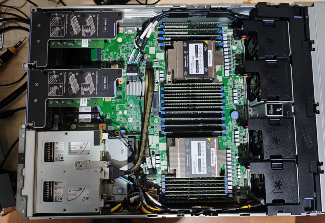 主板基本没有空余的焊盘,基本都焊有元器件。机器标配2个Riser卡,后置硬盘笼。
