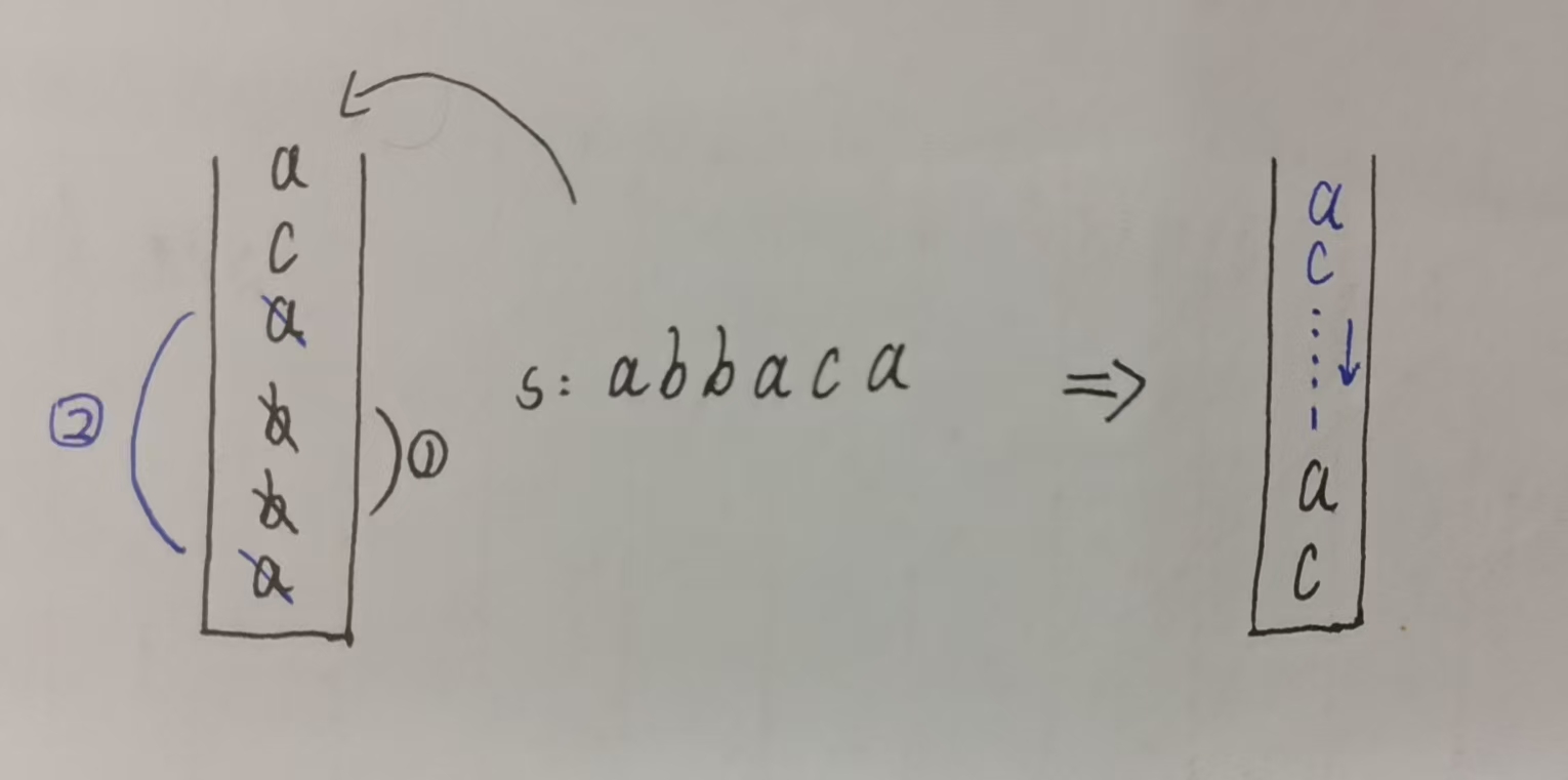 - 如果当前字符与栈顶字符相同,说明找到了相邻重复项,将栈顶弹出(相当于消除这一对)