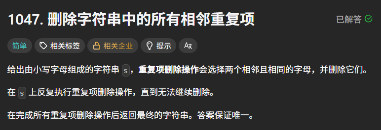题目的难点并不在于"知道要用栈"之后实现逻辑是多么多么的复杂,而在于如何从问题描述中快速识别出这是栈的适用场景。本题正是这样一个"最小可用示例"------通过一个简洁的场景,能够帮我们建立起 "遇到相邻匹配/抵消问题时,优先考虑栈" 的思维直觉,更值得深究的是,当掌握了栈的解题思路后,还能进一步探索"用更轻量结构替代栈"的优化方向,用最少的代码实现最优性能。