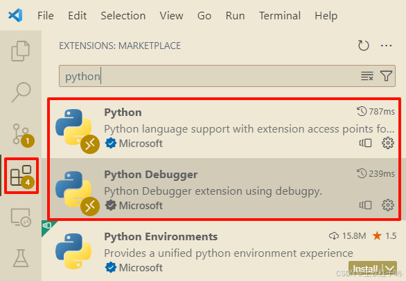 点击左侧最下方的 "扩展"图标(四个方块组成的图标 🧩),或者按快捷键 Ctrl+Shift+X (Windows/Linux)或 Cmd+Shift+X(Mac)。在搜索框输入 Python。找到由 Microsoft 发布的 Python 插件(图标是蛇🐍),点击 Install。