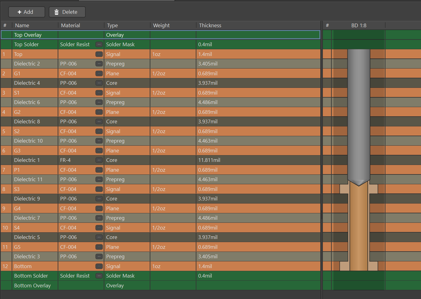 在图示的例子里我选择了全部,但是工程里面我只有一个背钻模型BD1:8, 对于不符合的信号过孔不会添加,效果如下,只有1:8有stub的孔才会被添加上背钻,