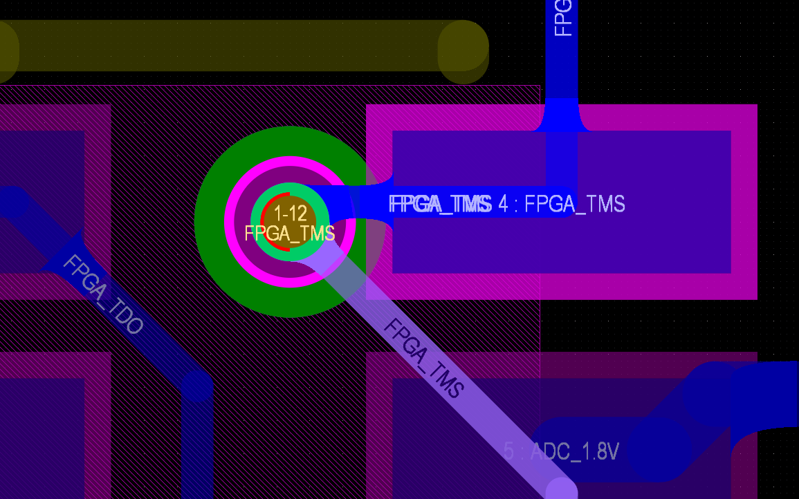 蓝色线是bottom层,其他线条所在层见图标识,我们设置的是BD1:8的背钻模型,在配置完规则之后,实际效果是什么样的呢,
