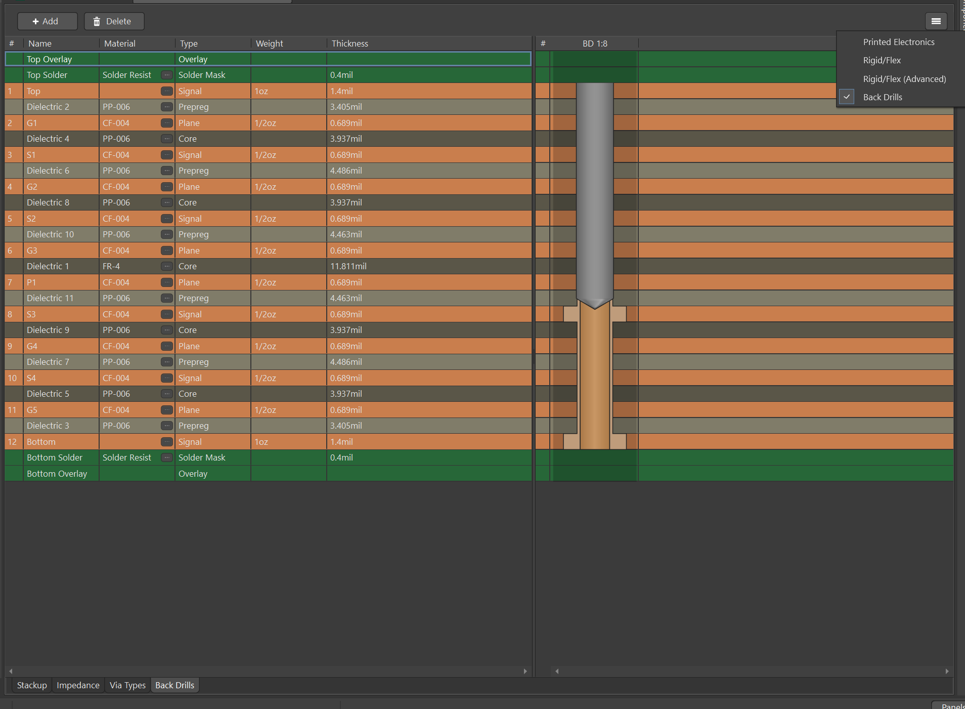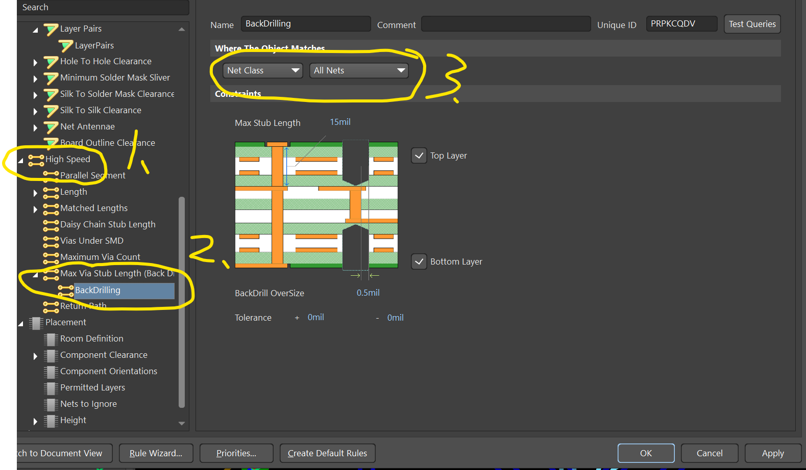 设置完之后,工程里就相当于有了这样一个背钻模型,但是具体要应用到那个过孔上,还需要在规则里面进行配置,