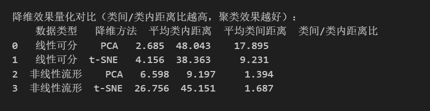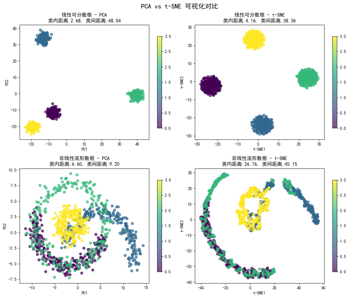 | 对比维度 | PCA(线性降维) | t-SNE(非线性降维) |