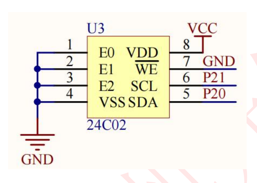 在图中并没有看到 SCL 和 SDA 管脚有上拉电阻,这是因为开发板单片机 IO 都外接了 10K 上拉电阻,当单片机 IO 口连接到芯片的 SCL 和 SDA 脚时即相当于它们外接上拉电阻,所以此处可以省去。