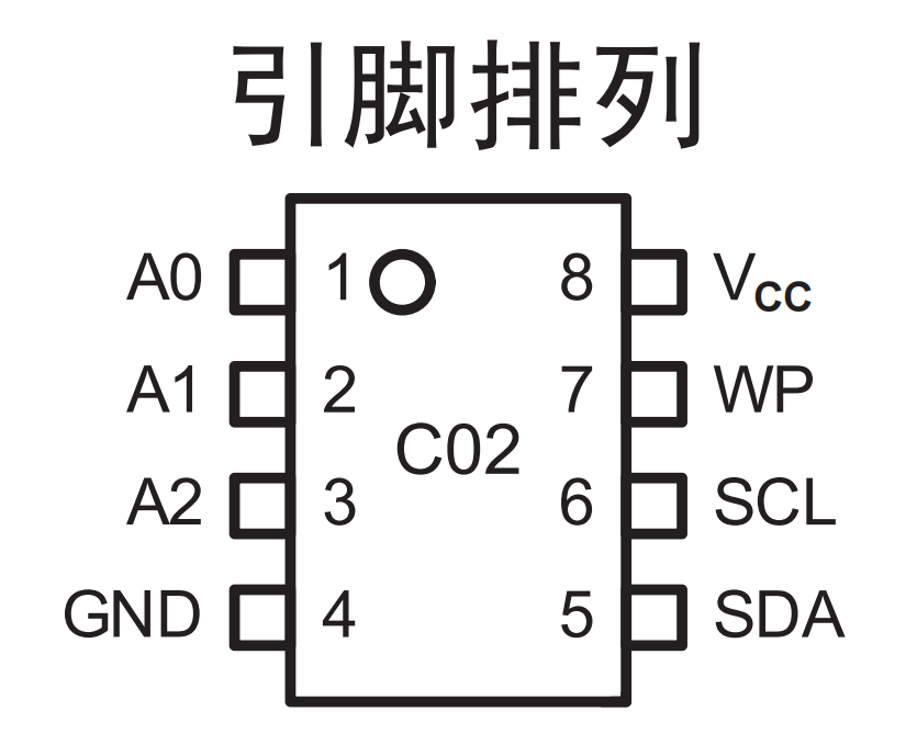 开发板上使用的是 AT24C02(EEPROM) 芯片,此芯片具有 I2C 通信接口,芯片内保存的数据在掉电情况下都不丢失, 所以通常用于存放一些比较重要的数据等。AT24C02 芯片管脚及外观图如下图所示: