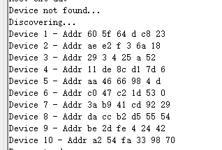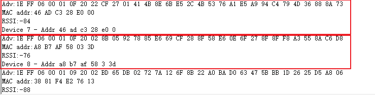 在示例中,只是做了简单的 MAC 地址打印处理,在每次扫描到广播包以后,只要不到设定的最大扫描值DEFAULT_MAX_SCAN_RES(示例中为 10),都会把扫描到的设备 MAC 地址打印出来 ,如下图: