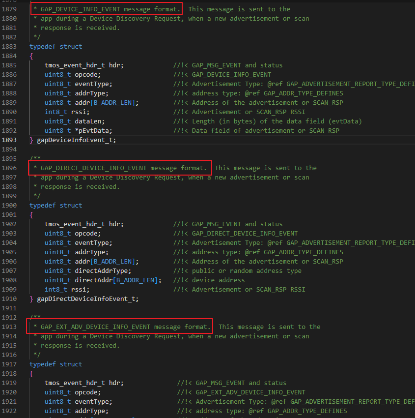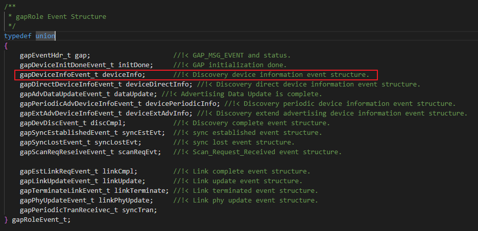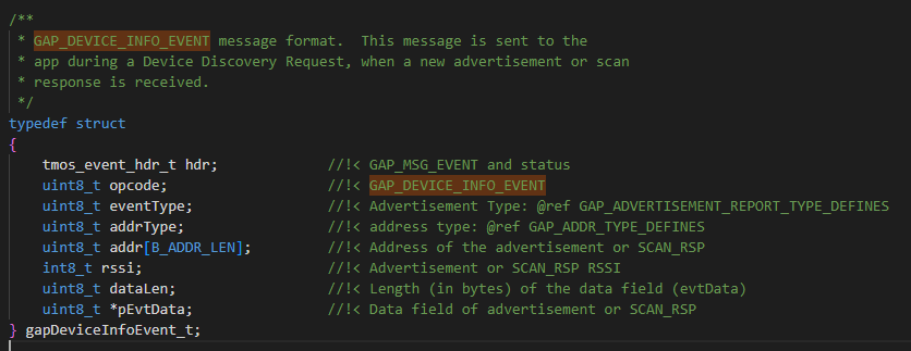 每一个结构体都有一个opcode 的成员变量,来表示本次是什么事件,我们收到广播消息的传递的结构体为 gapDeviceInfoEvent_t 结构体,这些都是可以通过代码查看得到的 :