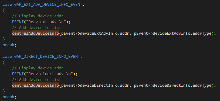 除了通常的 GAP_DEVICE_INFO_EVENT ,官方主机示例还支持 BLE5.0 的扩展广播,和定向广播接收,他们是以独立的事件存在的,但是使用后的是同一个处理函数centralAddDeviceInfo ,如下图: