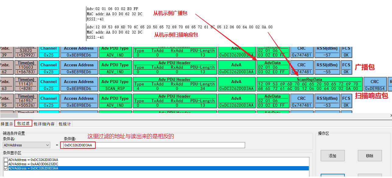 我们把蓝牙数据全部都打印出来了,我们可以根据广播报文格式进行解析,蓝牙广播包格式直接看博主以前的文章 BLE 蓝牙空中报文格式与解析(广播包) 就好,这里我直接使用蓝牙分析仪直接抓包对比。
