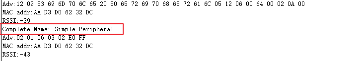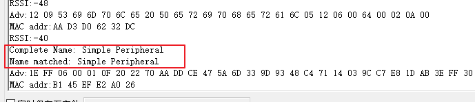 上面是打印出广播包里面的蓝牙名字,不管是广播包还是扫描响应包,只要有名字就能够打印出来。