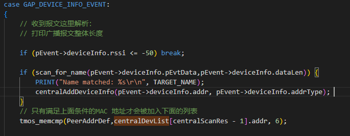 在官方示例中,在扫描完成事件case GAP_DEVICE_DISCOVERY_EVENT: (就在我们上面收到广播包GAP_DEVICE_INFO_EVENT的下面一个分支)设备会查找是否扫描到自己想连接的 MAC 地址设备,进入连接或者重新扫描。