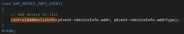 centralAddDeviceInfo(pEvent->deviceInfo.addr, pEvent->deviceInfo.addrType);