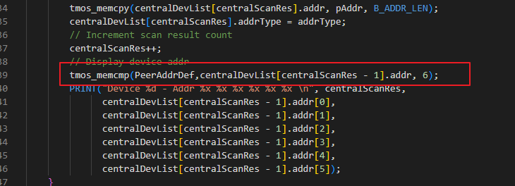 我们可以看到,这里我们找到设备名字,然后把 MAC 地址保存,能够正常进行连接。 但是通过打印我们可以判断上面的做法 tmos_memcpy 会执行多次,虽然没有使用问题,但是还是可以优化一下。