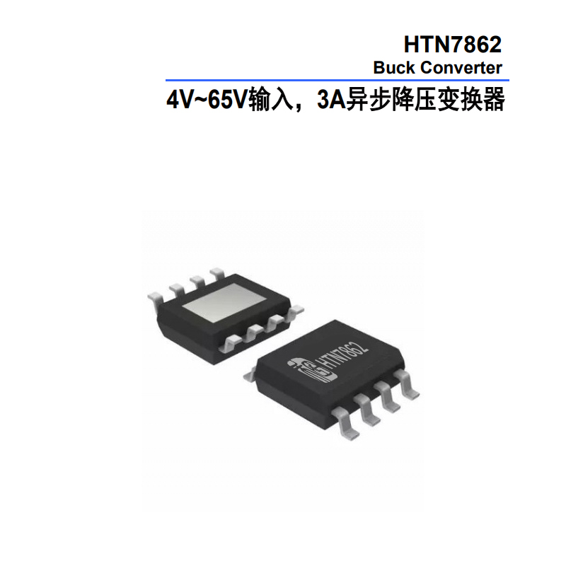 在工业自动化、电信通信、汽车电子等精密电子领域,电源系统的稳定性直接决定了设备的运行质量,而降压转换器作为电源系统中"变压调压"的核心部件,其性能表现至关重要。一款优秀的降压转换器需同时满足宽电压适配、高效率转换、灵活配置及可靠保护等多重需求,HTN7862这款3A降压转换器便凭借全面的性能优势,成为了多场景电源设计中的优选器件。