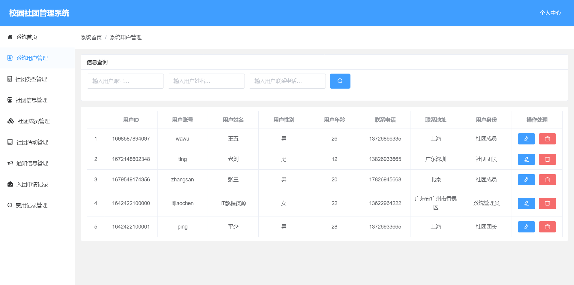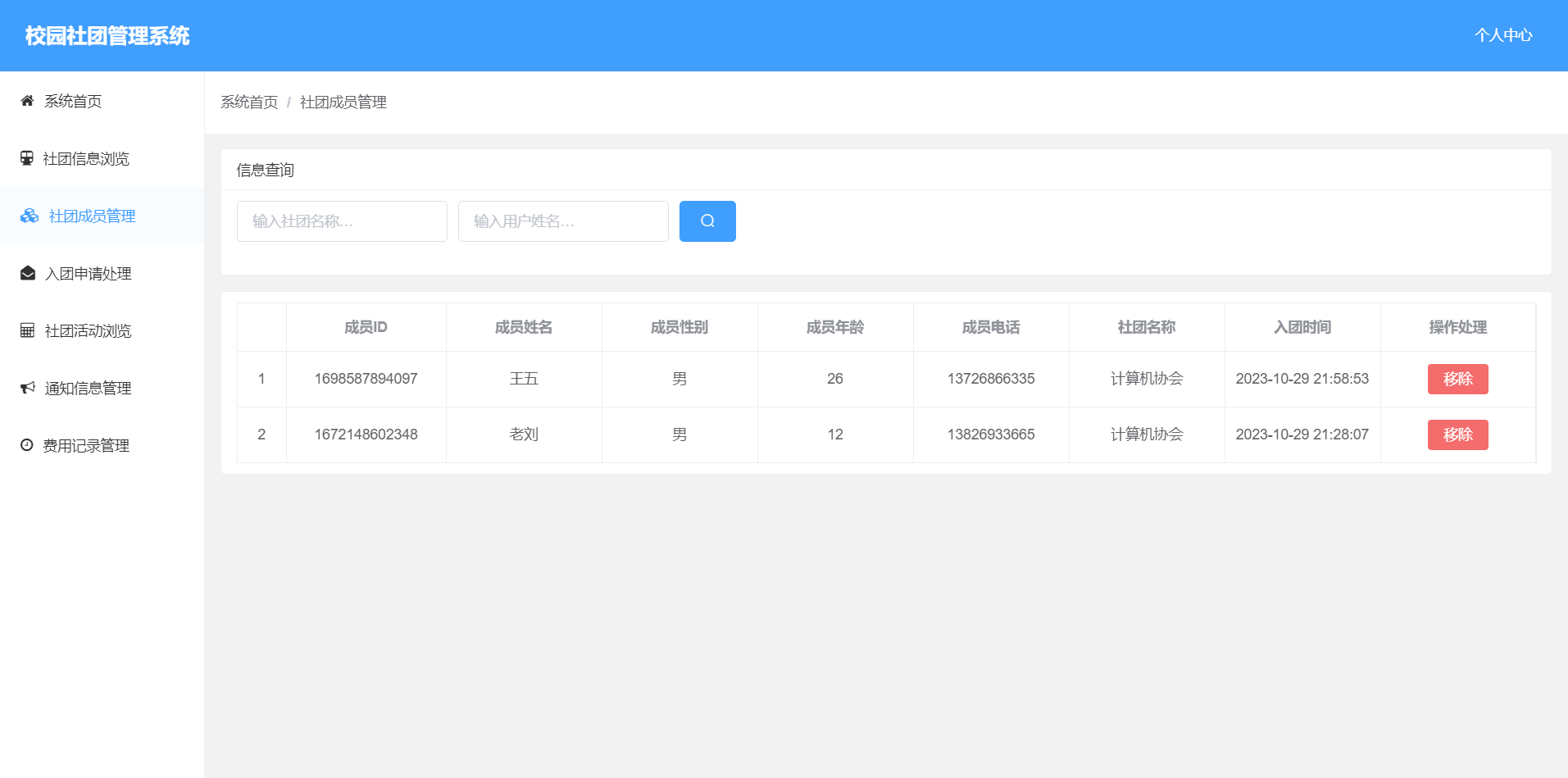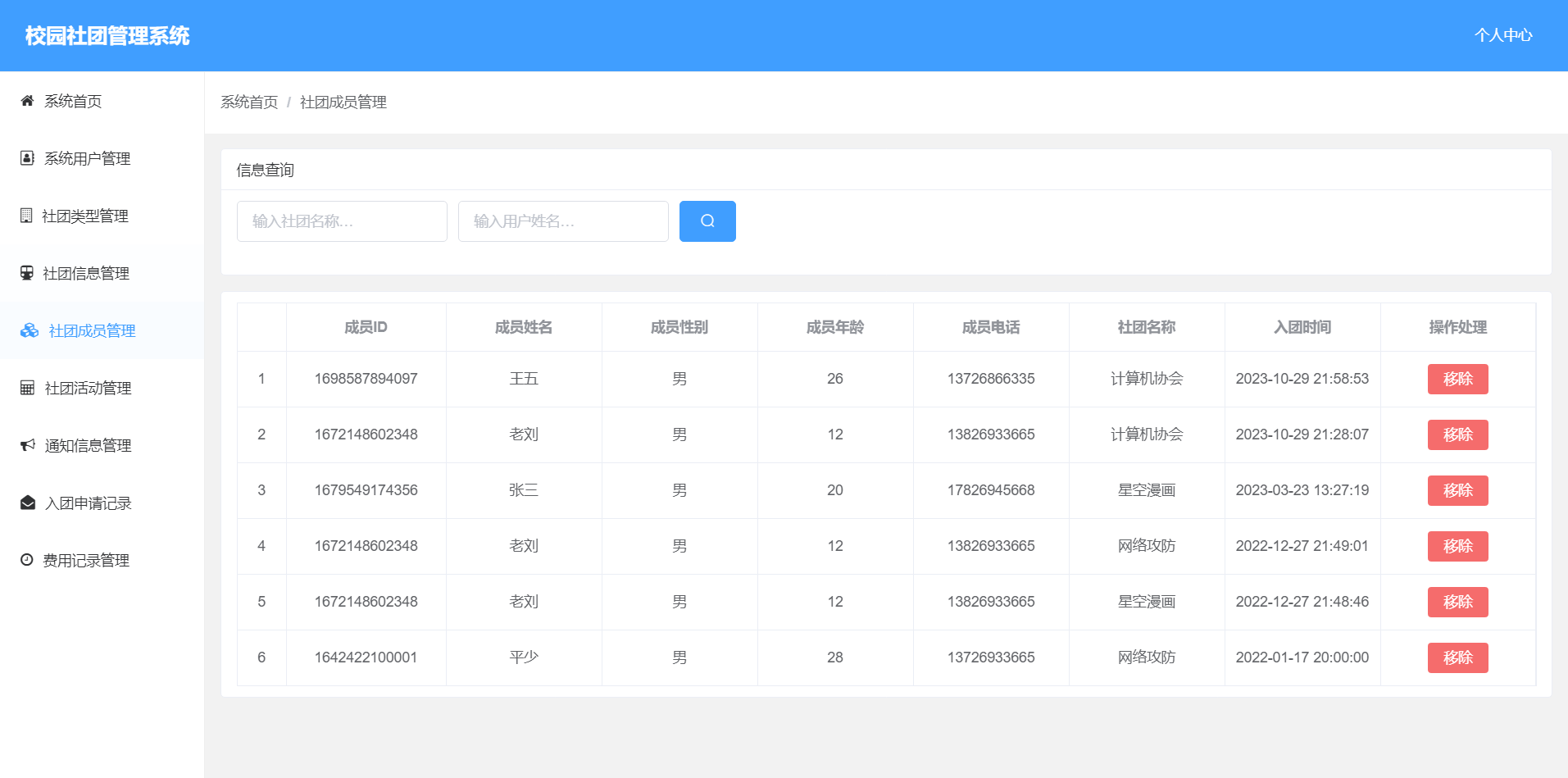 3.社团成员管理:实现对社团的成员查询和删除功能。